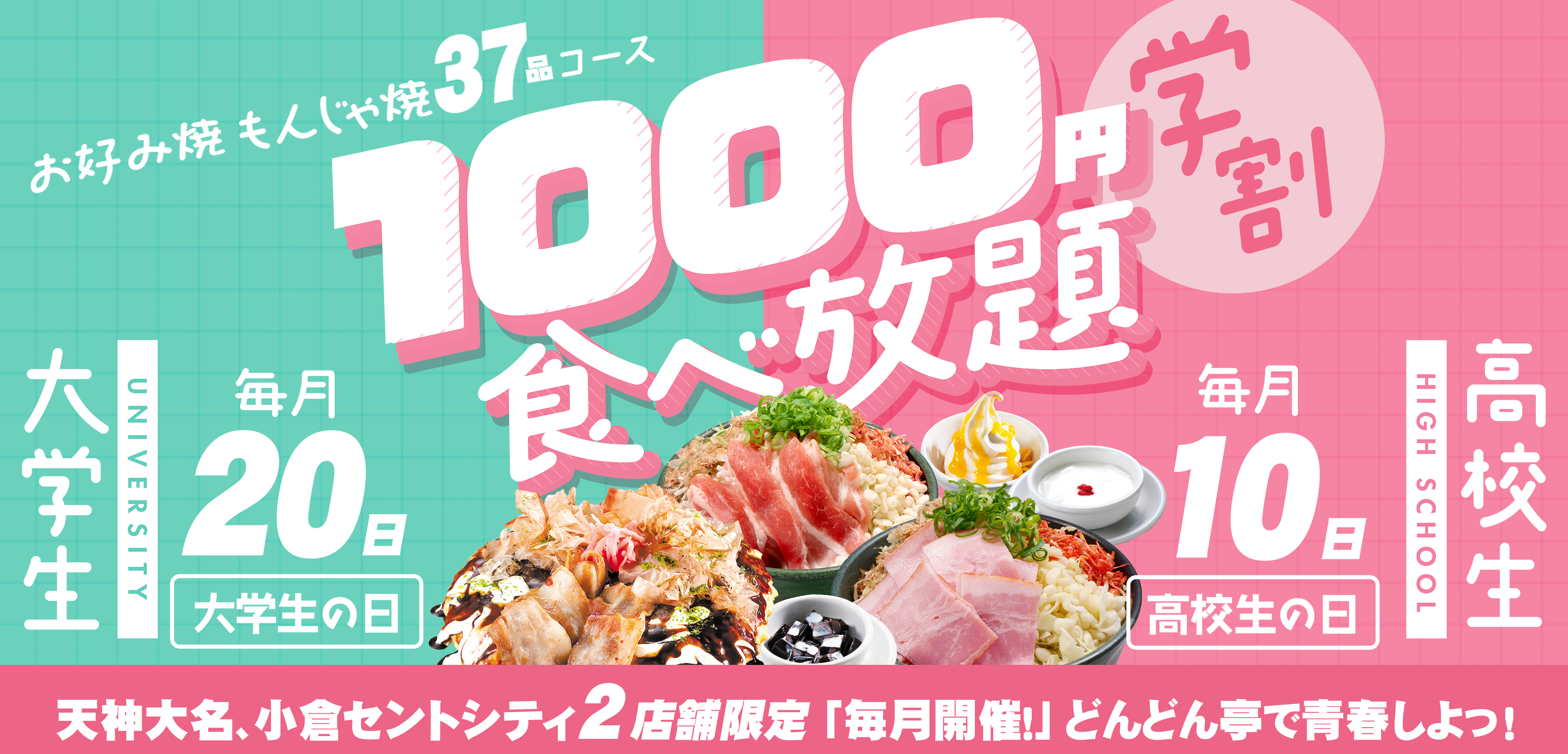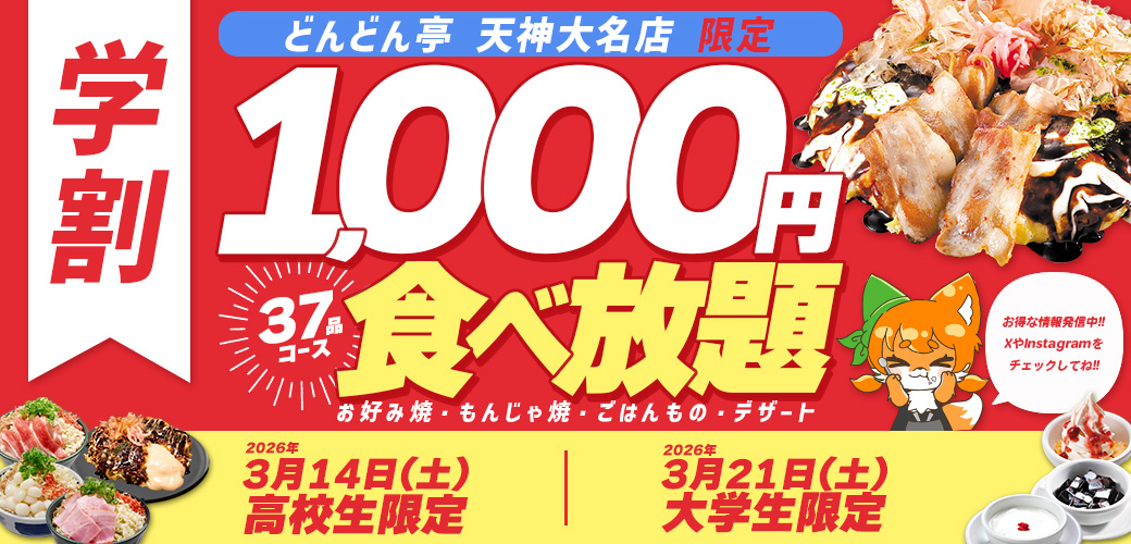【1,000円で食べ放題!?】「どんどん亭 天神大名店」で3月14日(土)高校生限定・3月21日(土)大学生限定のお得なイベントを開催します!