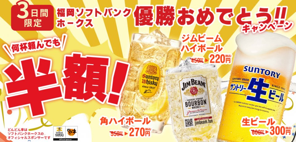 【3日間限定!!】9月29日(月)からホークスリーグ優勝キャンペーン!!ビールなどアルコール3種が何杯飲んでも半額(2025年9月29日~10月1日)