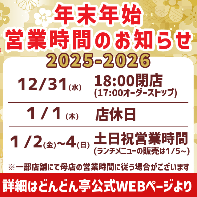 期間中にどんどん亭へのご来店を検討されているお客様は、通常の営業時間とは異なりますのでご注意ください。