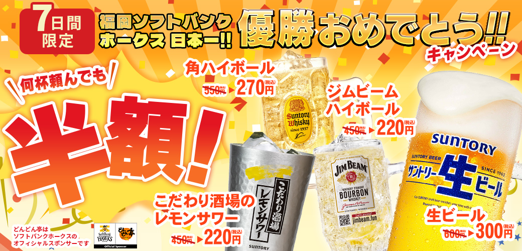 福岡ソフトバンクホークスの日本一を祝って、11月4日(火)からどんどん亭全店で生ビール、ハイボール、レモンサワーが何杯頼んでも半額になります!!