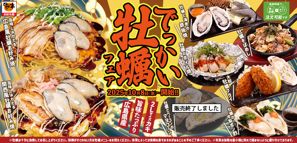広島県産のでっかい2Lサイズ規格の牡蠣をふんだんに使用した『関西風牡蠣お好み焼』や『広島風牡蠣お好み焼』をはじめ、毎年大人気の食べ応え抜群『牡蠣の冷製ポン酢』など、牡蠣好きにはたまらないフェアメニューの数々をご準備いたしました。